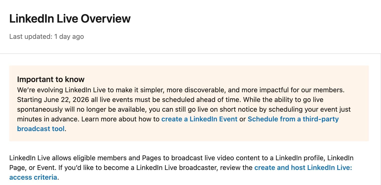 LinkedIn is killing spontaneous live streaming with new scheduling rules. From 22 June, every live event must be scheduled in advance.