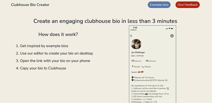If, like so many other people right now, you're having fun trying out Clubhouse, this simple tool helps you create a profile bio that suits the platform from the comfort of your desktop computer. TIP: use the example bios as a starting point.